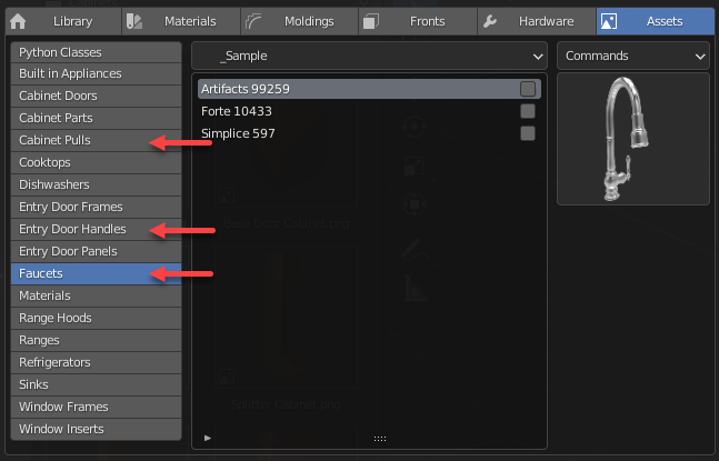 You can save objects to the Home Builder Library to extend the available faucets, cabinet doors handles, and entry door handles.